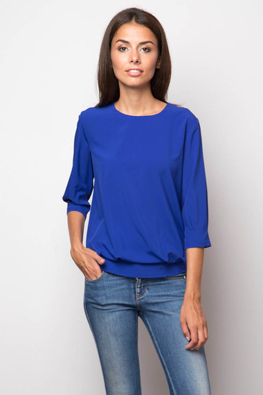 ОписаниеЯркая блузка с рукавами 3/4 Модель свободного кроя, сзади изделия небольшая золотистая молния.